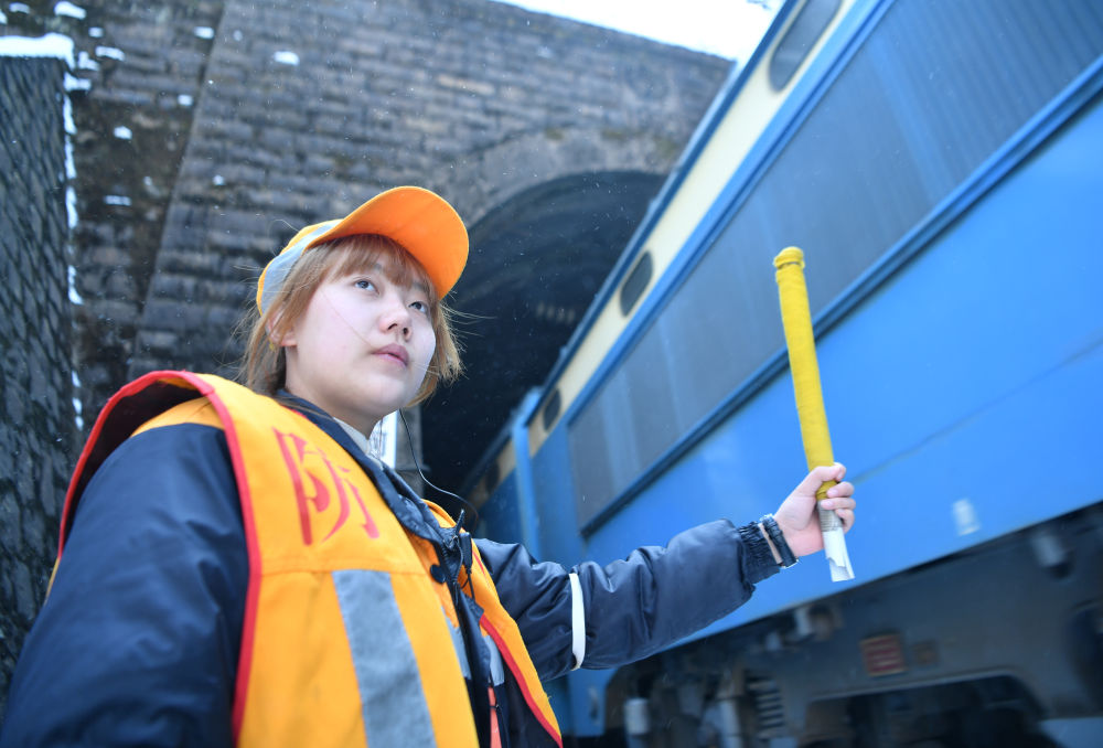 巨大的轰鸣声与夹杂着雪花的疾风同时袭来,列车经过隧道口,张雅旭高举信号旗,凝望着列车,站得笔直。