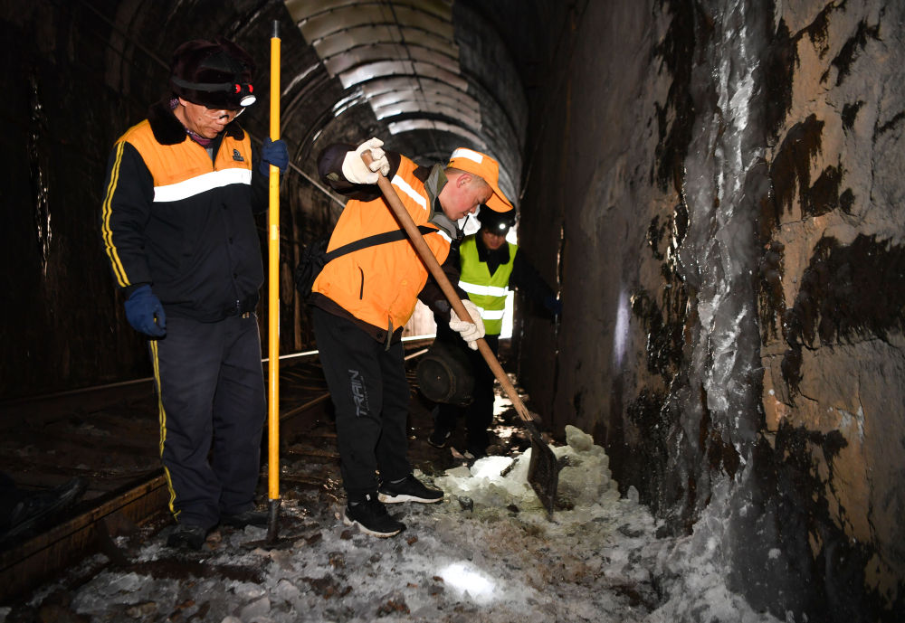 冰柱高,冰层厚。王乖明与工友轮番上阵,打冰杆与铁镐交替登场。一阵“刀光剑影”,隧道壁与道床“破冰”成功。