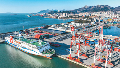 经过多年发展,山东省荣成市石岛管理区石岛新港口岸已经成为中外客商认可的跨境电商重要中转港。图为“华东明珠8”号货轮近日在岸边等待装卸货物。李信君摄(人民视觉)