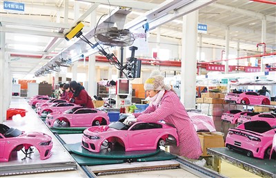 河北省邢台经济开发区近年来着力优化跨境贸易营商环境,推动外贸企业线上线下融合发展,开拓海外市场。图为日前,邢台市达力斯儿童玩具有限公司的工人加紧组装出口美国、德国的电动童车产品。赵永辉摄(人民视觉)