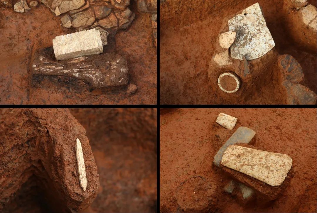 随葬玉器出土现场(玉琮、玉钺与玉环、玉锥形器、玉钺)