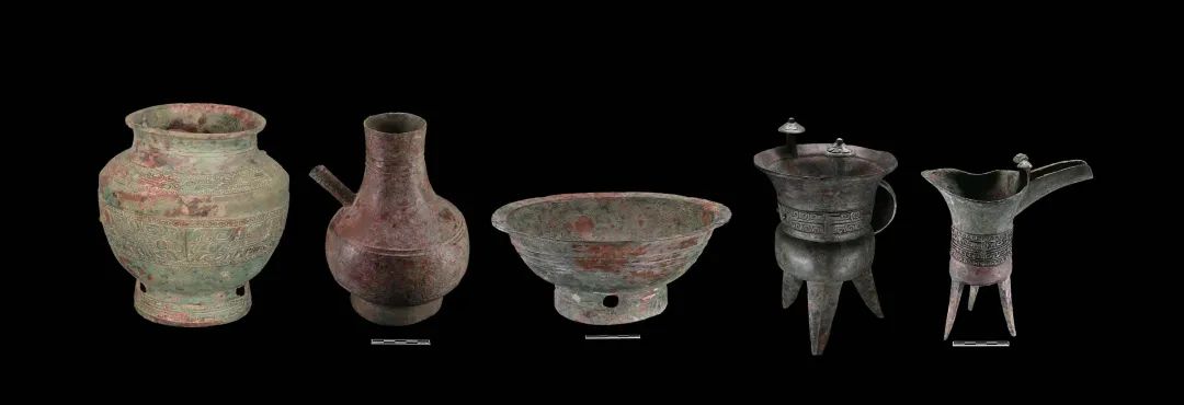 M2出土铜罍、盉、盘、斝、爵(M2 :1、2、23、3、8)