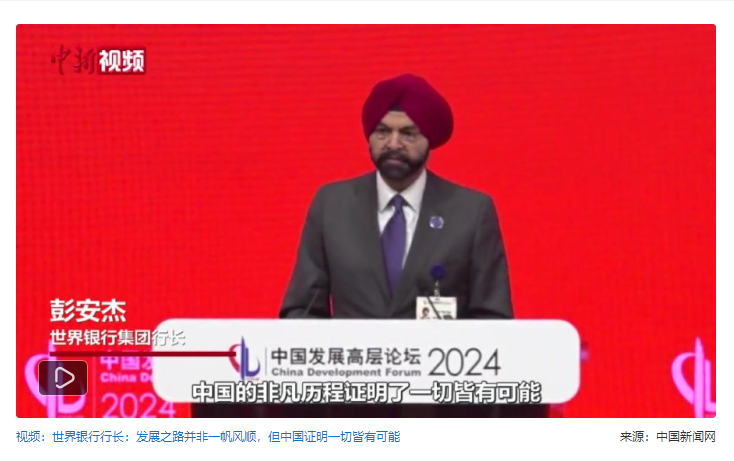 中新社北京3月24日电 (记者 刘文文)“发展之路并非一帆风顺,充满挫折、失误,所有经济体都是如此。但看看今天的中国,我们就知道一切皆有可能。”世界银行行长彭安杰(AJay Banga)24日在北京说。