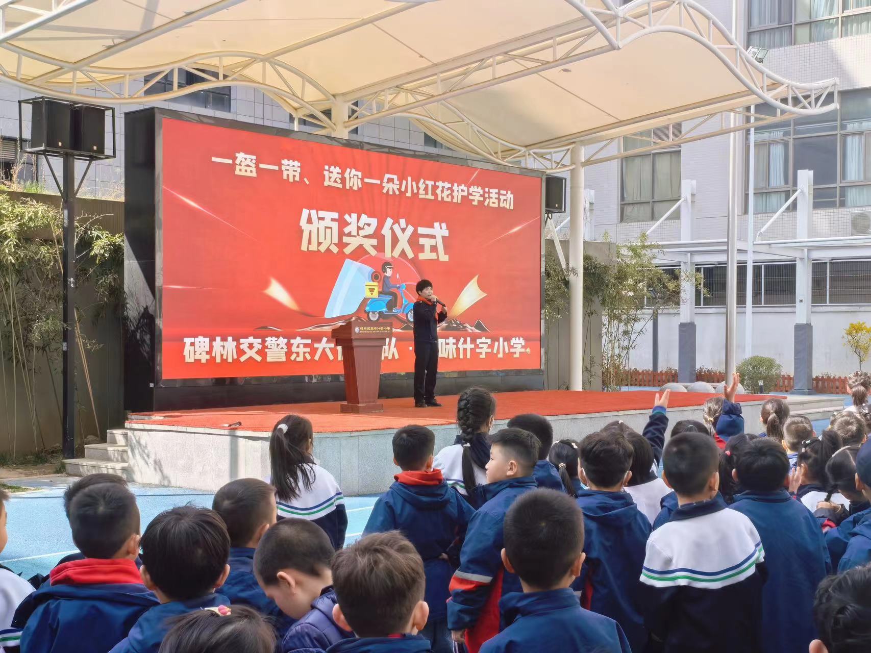 三秦都市报-三秦网讯(记者 李佳)为做好校园交通安全宣传工作,推动“送你一朵小红花”护学活动奖励机制形成闭环,近日,西安市公安局交警支队碑林交警东大街中队副中队长聂鑫带领网格民警韩雪,辅警刘洋走进五味什字小学,为本学期一直按规定佩戴头盔的学生颁发奖励证书及奖品。