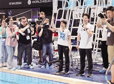 4月18日,奥运冠军全红婵和王宗源走进西安奥体中心游泳跳水馆,指导陕西省跳水队 20名小运动员训练。