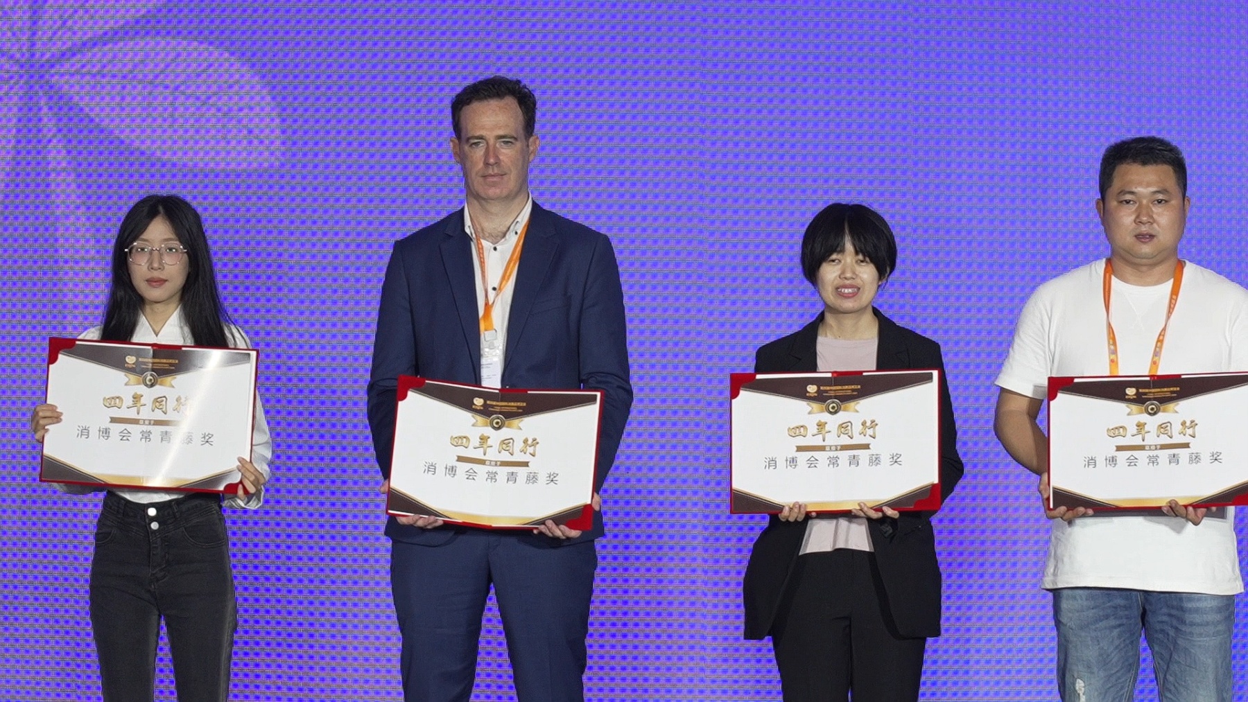 睦百瑞(左二)代表爱尔兰驻华使馆领取消博会常青藤奖