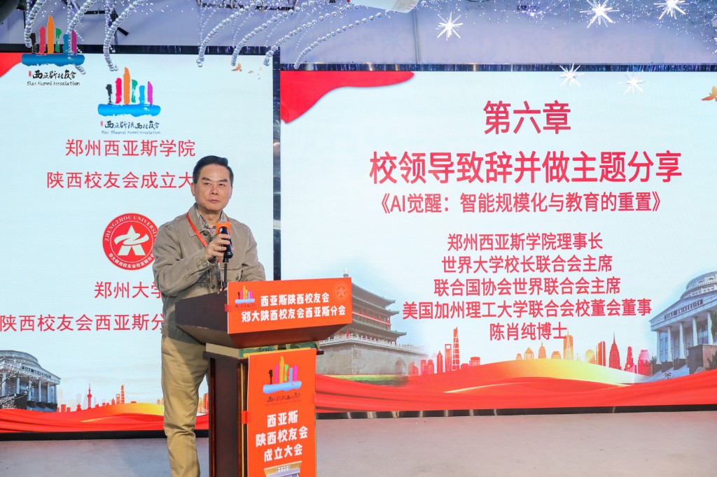 陕西省慈善联合会特邀专家陆宝延,陕西省政协常委、省工商联副主席范保强,郑州大学陕西校友会会长温小郑,郑州西亚斯学院理事长陈肖纯博士纷纷发表致辞。陈肖纯博士还在会上进行了题为《AI觉醒:智能规模化与教育的重置》的主题分享,展望了人工智能对未来教育的影响。