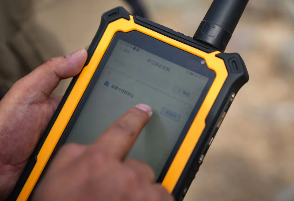 4月11日,普查人员手持移动端数据采集设备在曲果岗塔群遗址现场开展数据采集。晋美多吉摄
