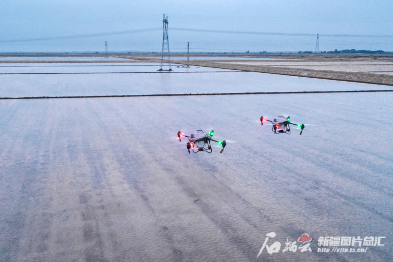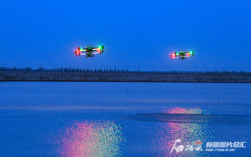 4月22日,晚11点,无人机夜间在阿克苏市柳源镇万亩水稻田播种。