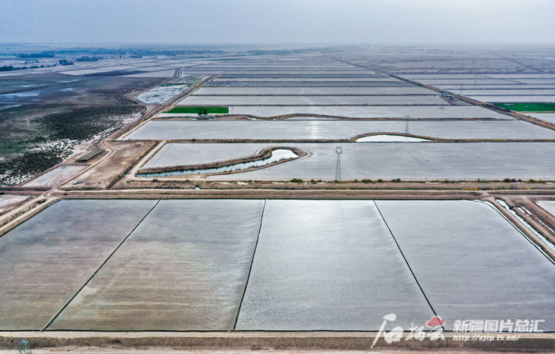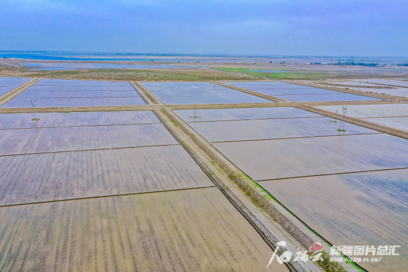 4月22日,航拍位于阿克苏市柳源镇的万亩水稻田。(无人机航拍图片)
