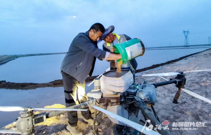 4月22日,农民在阿克苏市柳源镇为无人机装填水稻种子。