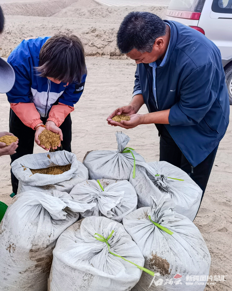 4月22日,阿克苏市柳源镇农民在检查即将播撒的水稻种子。
