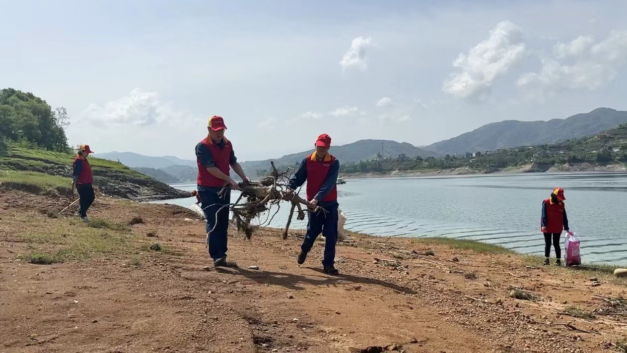 五一前夕,在瀛湖玉兴岛附近,国网安康水电厂漂浮物打捞队员正对水位回落岸坡形成的杂木垃圾进行清理,及时打捞清运湖面漂浮物,确保“河畅、水清、岸绿、景美”。