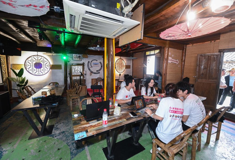 2023年8月11日,高校艺术院系的大学生们在宁波市宁海县葛家村的特色酒吧内讨论村落艺术改造提升的设计方案。新华社记者 徐昱 摄