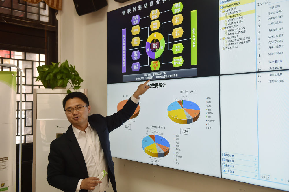 “渔博士”沈杰在浙江省湖州市菱湖镇创办的公司内介绍汇集养殖户、饲料厂商、销售档口、金融机构等相关方的物联网平台(资料照片)。新华社记者 黄宗治 摄