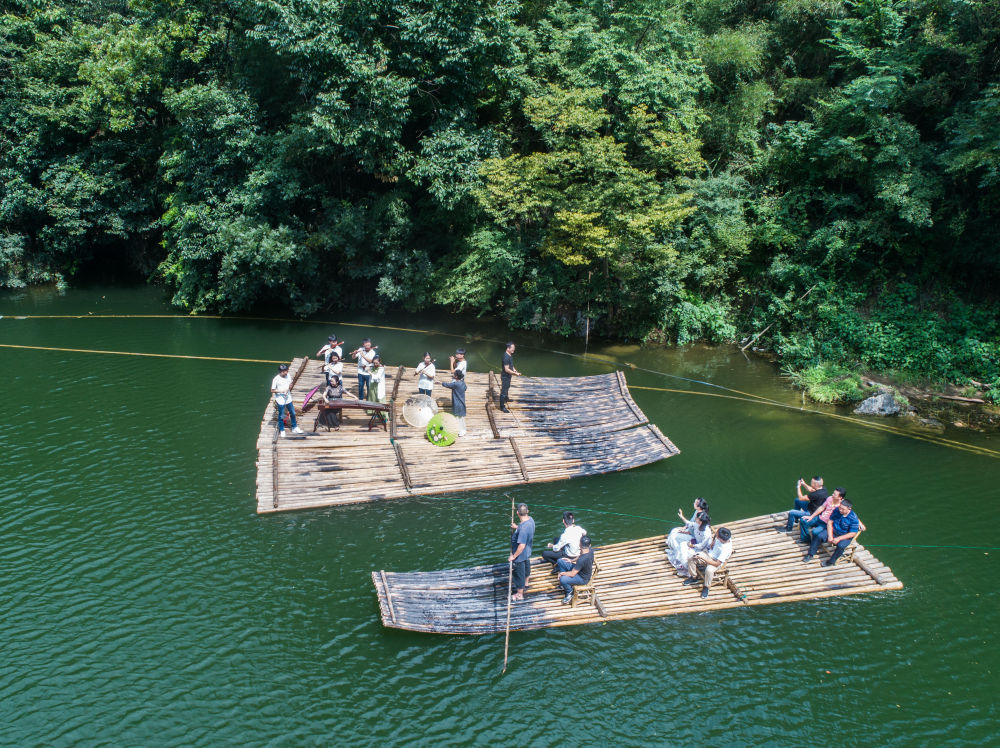 在杭州余杭区中泰街道,演奏者在竹排上演奏竹笛(资料照片)。新华社记者 徐昱 摄