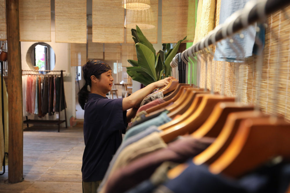 2023年5月23日,在浙江省义乌市李祖村,“农创客”鲍丽萍在店铺里整理服装产品。新华社记者 杜潇逸 摄