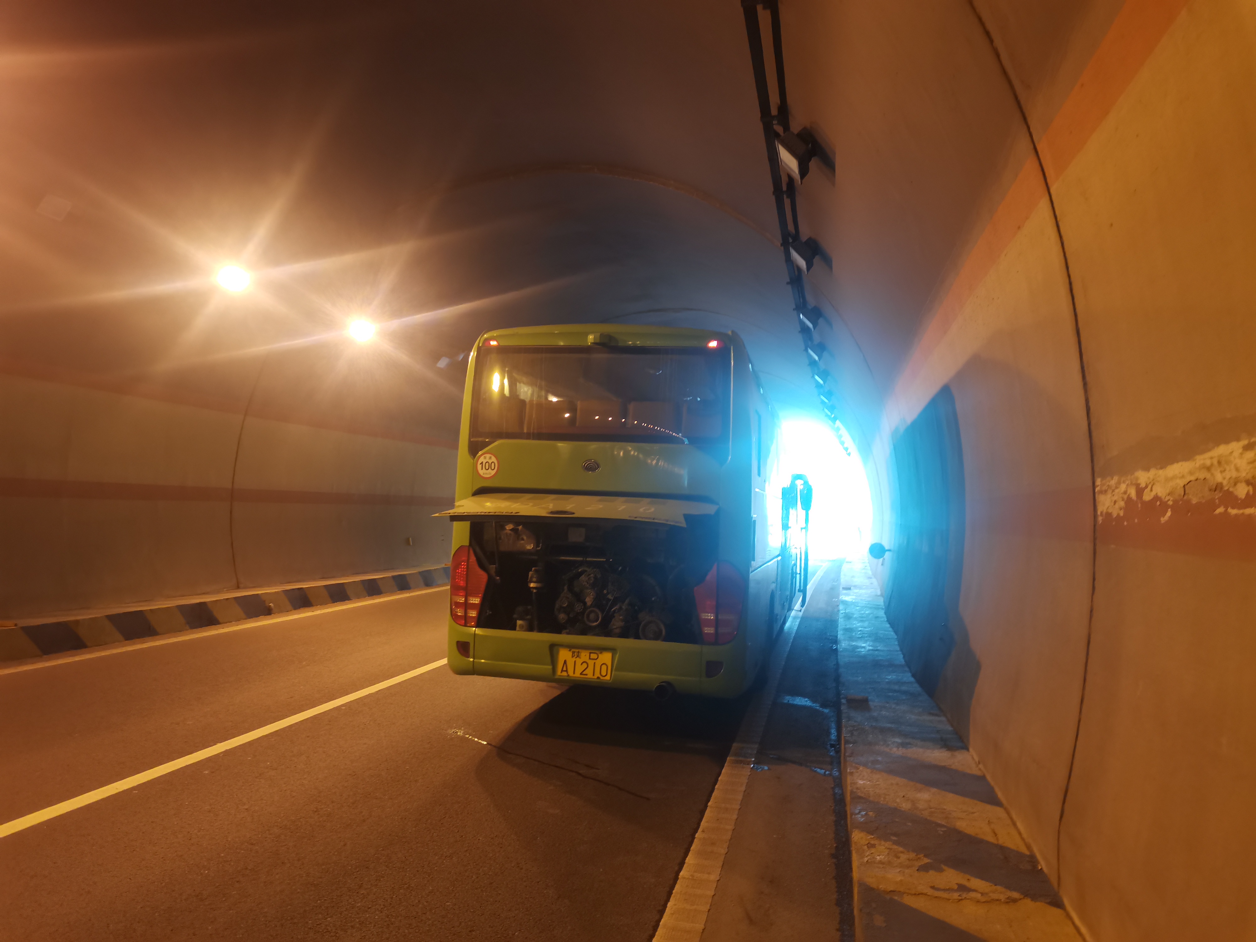 面对突发情况,巡查人员立即在故障车辆后方150米开外摆放交通警示锥,对过往车辆进行疏导,同时上报监控分中心和通知隧道监控变更隧道指示灯,并帮助故障大巴车司机沟通修车事宜。由于事发地点处于隧道内,停车风险大,为保障车上乘客安全,巡查人员果断将车上乘客全部疏散至高速公路护栏外安全地带。
