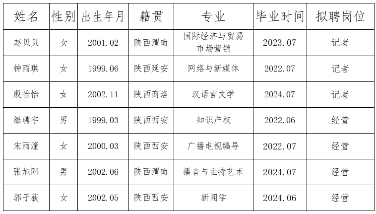 拟试用人员公示7个工作日,公示时间:2024年7月1日至2024年7月9日。公示期间,如对拟试用人员有异议,请向三秦都市报社办公室实名反映。