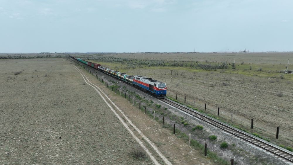 2023年5月12日,在哈萨克斯坦阿拉木图附近,货运列车驰骋于阿拉木图与霍尔果斯间(无人机照片)。新华社发(奥斯帕诺夫摄)