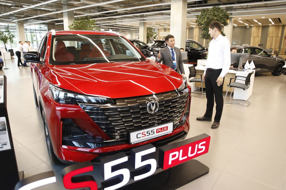 2024年6月24日,顾客在哈萨克斯坦阿斯塔纳了解中国品牌汽车。新华社发(奥斯帕诺夫摄)
