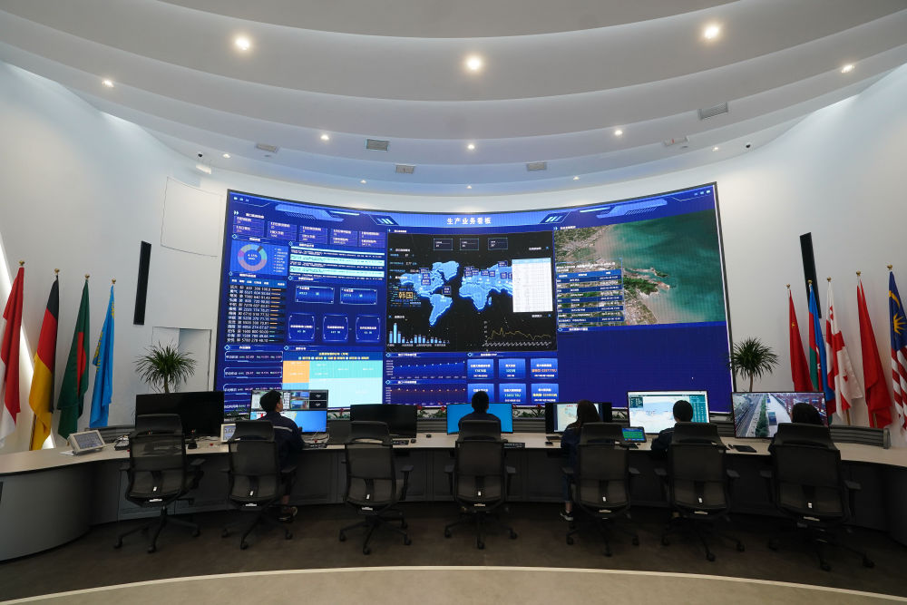 2023年5月9日,工作人员在中哈连云港物流合作基地数字化调度中心查看实时作业数据。