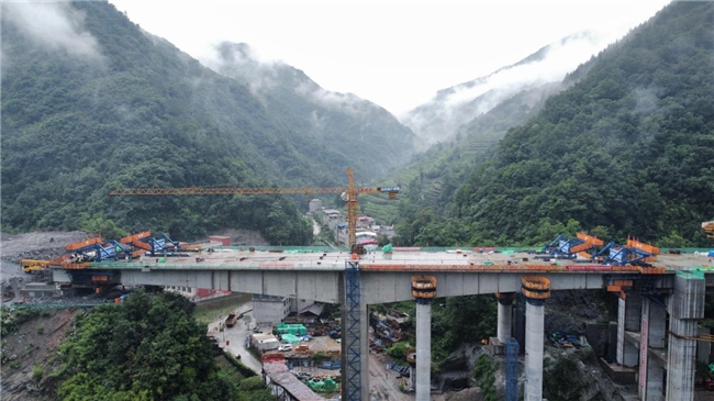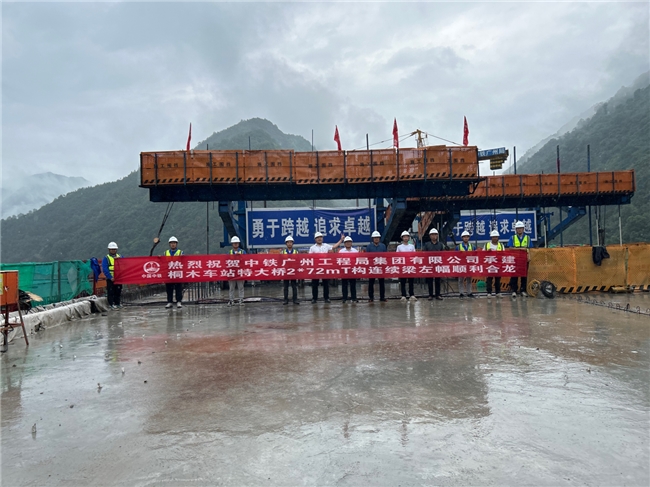桐木车站特大桥位于陕西省安康市旬阳县,桥梁全长820.55m,为西康高铁全线控制性工程。桐木车站为两台四线站,大桥为排洪兼车站而设,全桥现浇梁共67片,该桥地处秦岭深山峡谷,项目首创“狭窄V型山谷高铁高架车站桥现浇梁横移施工技术”,克服了施工场地狭小难题,节约了高墩支架施工成本。本次合龙为无砟轨道预应力混凝土双线2×72m左幅T构,桥面宽度12.59m、高度41.54m。合龙段采用悬浇段菱形挂篮施工,合龙临时锁定采用支拉共同锁定方法,在梁体顶、底板顶面各设置3道工字钢劲性骨架,刚性支撑连锁后将上下共4道预应力筋按每束1000KN同时对称张拉。