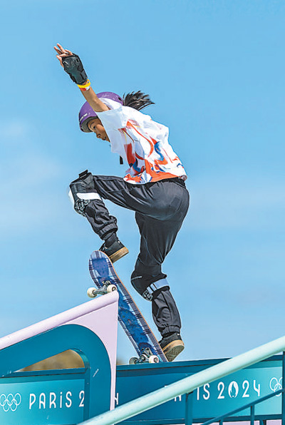 当地时间7月28日,中国体育代表团选手崔宸曦在巴黎奥运会滑板女子街式预赛中。