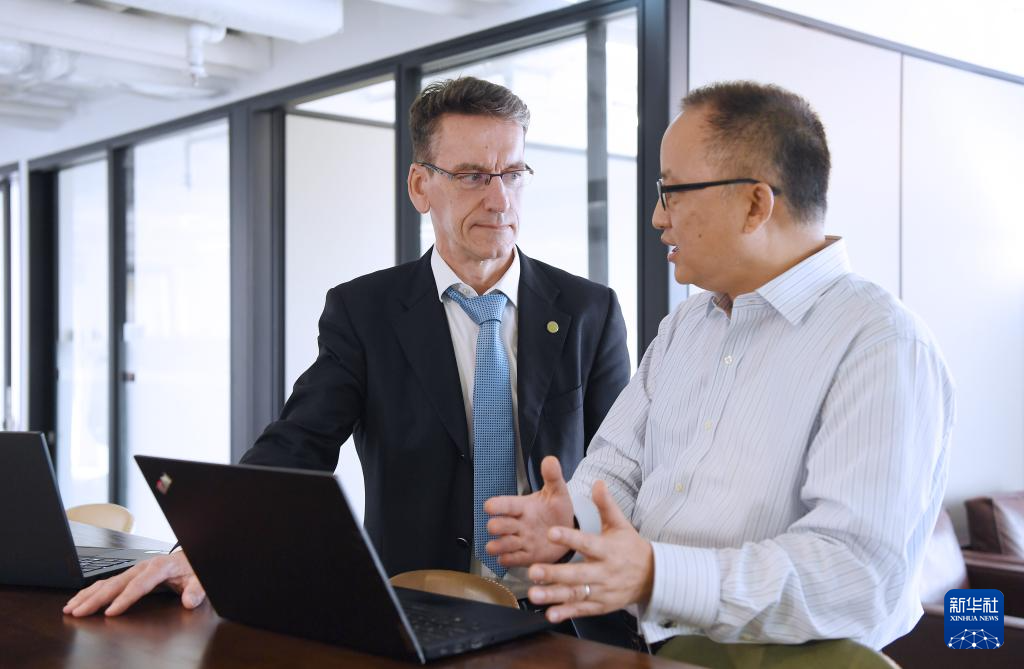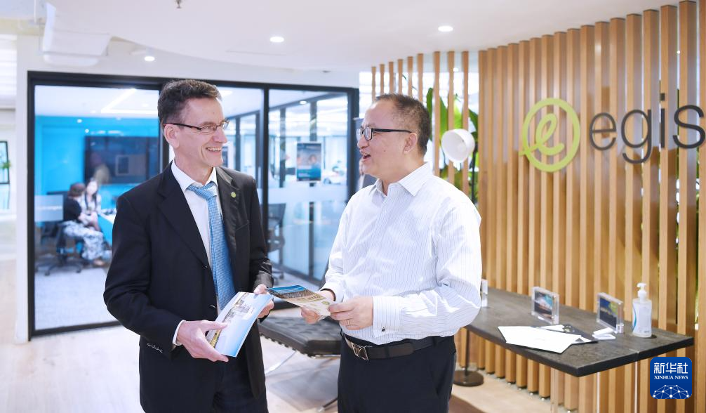 6月24日,法国Egis集团亚洲首席执行官马蒂厄·克罗尔(左)和法国Egis集团香港及澳门董事总经理熊健(右)在位于香港的亚洲总部里交谈。 新华社记者 陈铎 摄