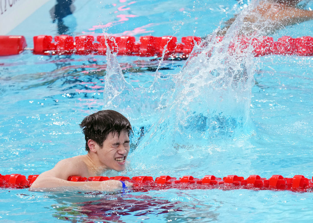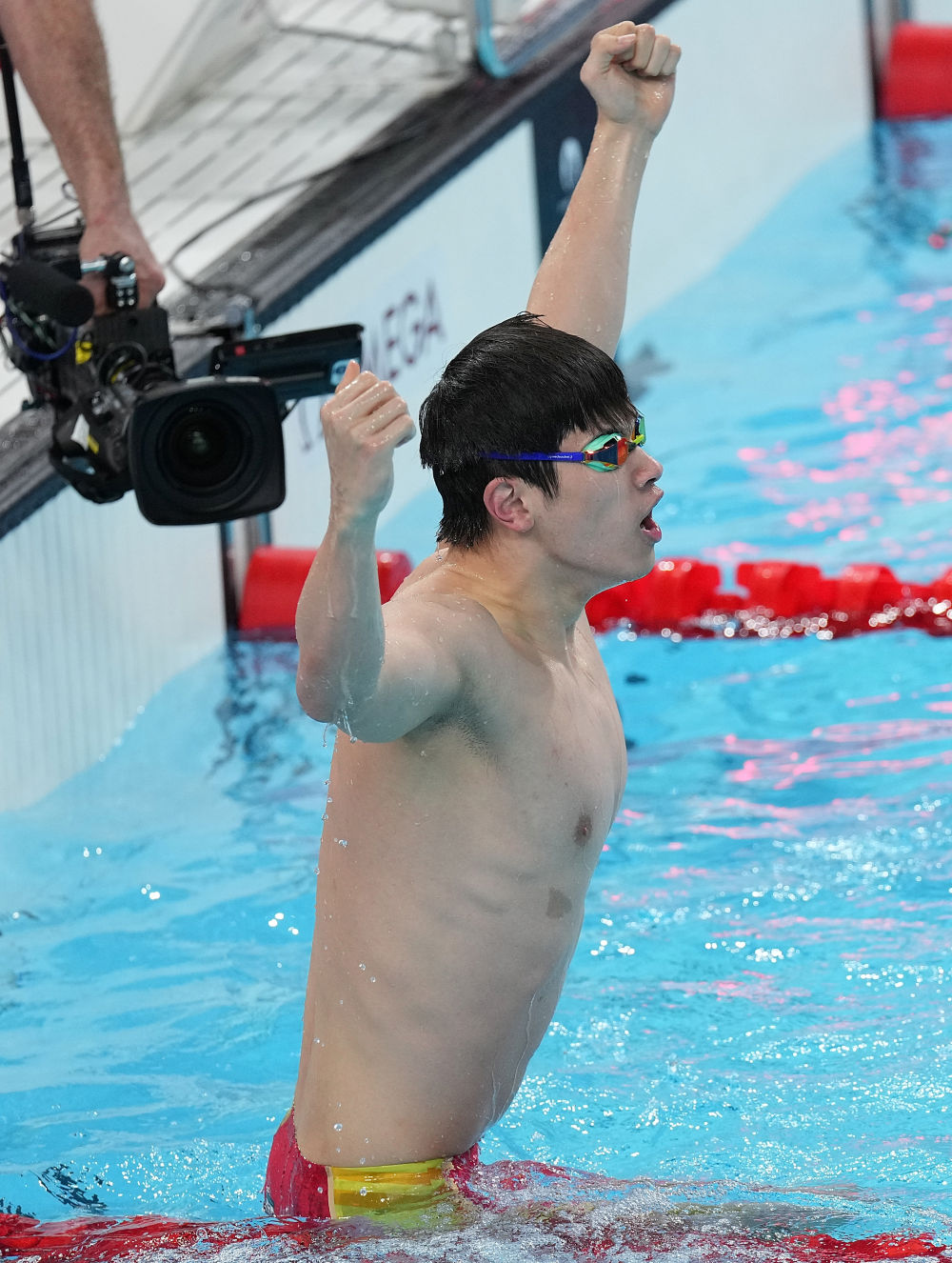 ↑中国选手潘展乐在比赛后庆祝。新华社记者 薛宇舸 摄
