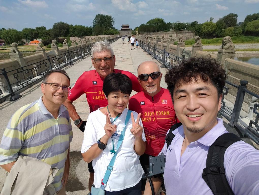 意大利自行车手阿尔贝托·菲奥林(后排左一)和迪诺·法基内蒂(后排左二)骑行到达北京后与友人合影留念。