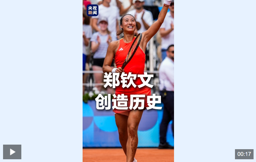 在刚刚结束的网球女单半决赛中,中国选手郑钦文战胜世界排名第一的对手,闯入决赛,创造中国网球单打奥运会最好成绩。太棒了,为这位“00后”姑娘点赞!