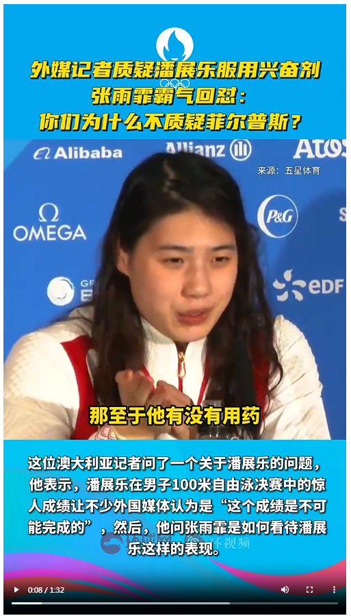 “相信他(潘展乐)在昨天以及入村之前,这一周都没有断过兴奋剂检测。至于他有没有用药,兴奋剂检测可以给出一个明白的指示,这不是我去判断的。至于他为什么能游这么快,那可能只有他的教练和他自己知道了。”张雨霏说。