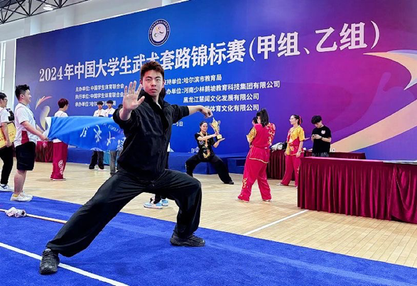 此次比赛我校由体育部贺家辉老师带队,来自国际教育与人文学院的党博鑫和新传媒与艺术学院的王艺衡两位同学参加了比赛。经过激烈的角逐,党博鑫获得男子甲组地躺拳项目第二名、双刀项目第四名、查拳项目第四名;王艺衡获得42式太极竞赛剑第四名、42式太极竞赛拳第八名、陈式太极拳第九名的成绩。