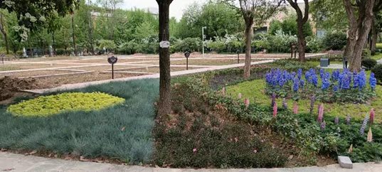 在教务处专项经费的支持下,对中草药园周边景观带进行建设,树立精品园林景观意识,选取具有较高观赏价值又有突出药用功效的观赏植物近30种,在品种选择上以“多样化”为原则,有木本植物、草本植物、观赏草以及地被草坪等多种类型,打造出形态多姿的中草药园周边景观环境。注重优良新品种的引进,选择近几年西北地区最新引进的生长稳定、表现优良的观赏植物新品种,为相关专业及学校风景园林艺术学院的学生创新设计、开阔视野、发挥引领示范功能。在局部设计上做到点、线、面相结合,以舒展流畅的曲线构图打造飘逸自然的带状花镜,突出体现了科学、专业与艺术的相结合,同时注重植物生态习性,耐阴性和喜阳性植物的合理布局,确保花镜未来稳定持续的景观效果。