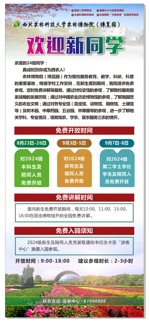 三秦都市报-三秦网讯 亲爱的2024级同学:真诚祝贺你成为西农人!农林博物院(博览园)作为学校服务教育、教学、科研、科普的重要基地,根据学校工作安排,在新生报到期间,博览园提供免费参观、定时免费讲解等服务。通过对校史馆的参观,了解学校服务国家战略的发展历程;通过对中国农业历史博物馆的参观,了解我国悠久的农业文明;通过对各专业馆(昆虫馆、动物馆、植物馆、土壤馆等)及树木园、中草药园、五谷园、林草铺等的参观,进一步了解相关学科、专业情况,培育知农、学农、爱农服务三农的情怀。