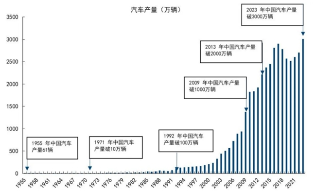 20世纪50年代是中国汽车工业历史的起点。经过数十年发展,2023中国汽车产销量首次双双突破3000万辆,创下历史新高,其中出口491万辆,同比增长57.9%。