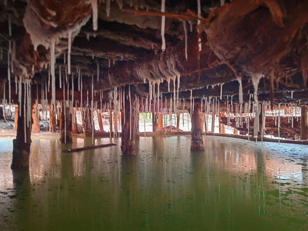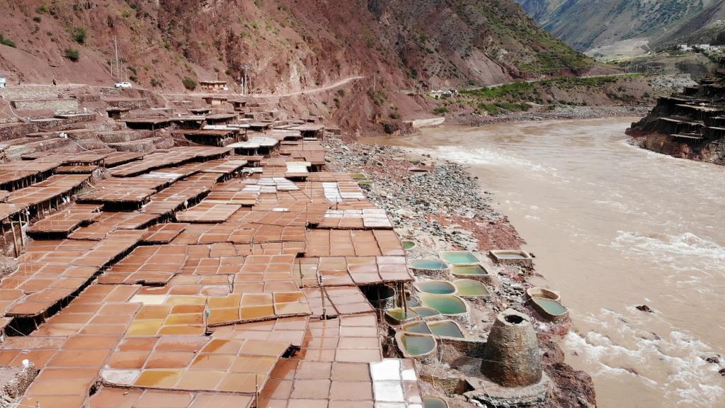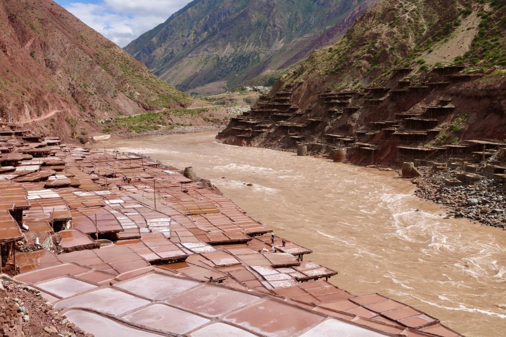 盐田在澜沧江两岸依山而建,由多根木柱搭架,架上用透水性强的泥土铺成平面夯实。