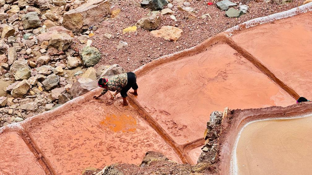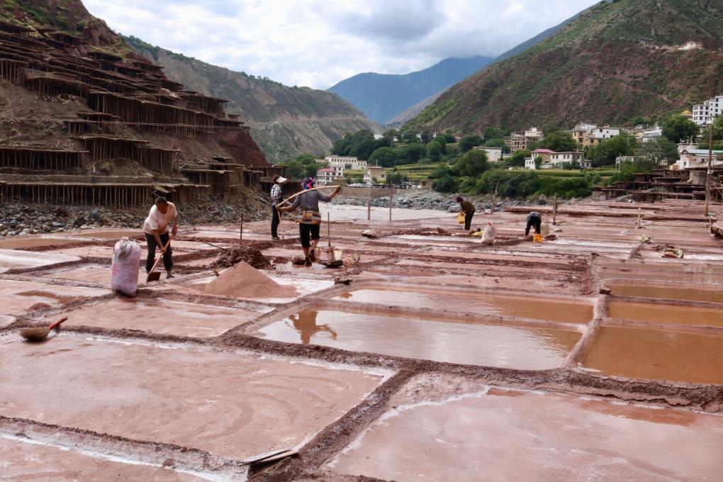 当地村民仍保持着原始的手工晒盐方式,他们从澜沧江畔的盐井、盐池中取出卤水倒入盐田,经阳光蒸晒、风干,结晶成盐。远远望去,盐田错落有致,景色奇美。