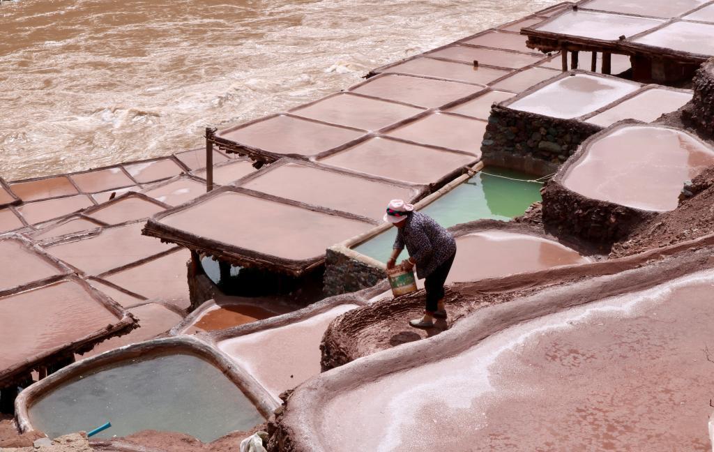 奔涌的澜沧江畔,一块块盐池星罗棋布,部分盛有卤水的盐池倒映天光云影。新华社记者沈晓朦 摄