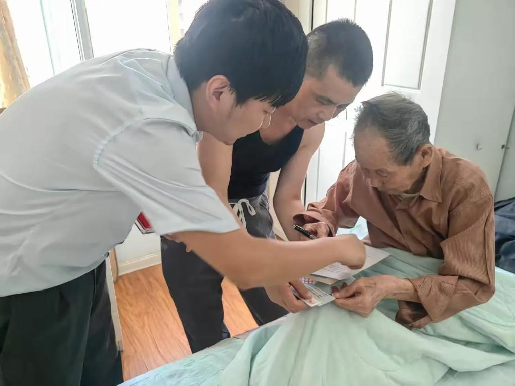 在王先生家中,工作人员耐心地与老人沟通,并协助完成了王先生被授权之后前往柜台办理业务。经过老人的授权后,工作人员通过相应的文件在柜台上办理了解除临时挂失业务。