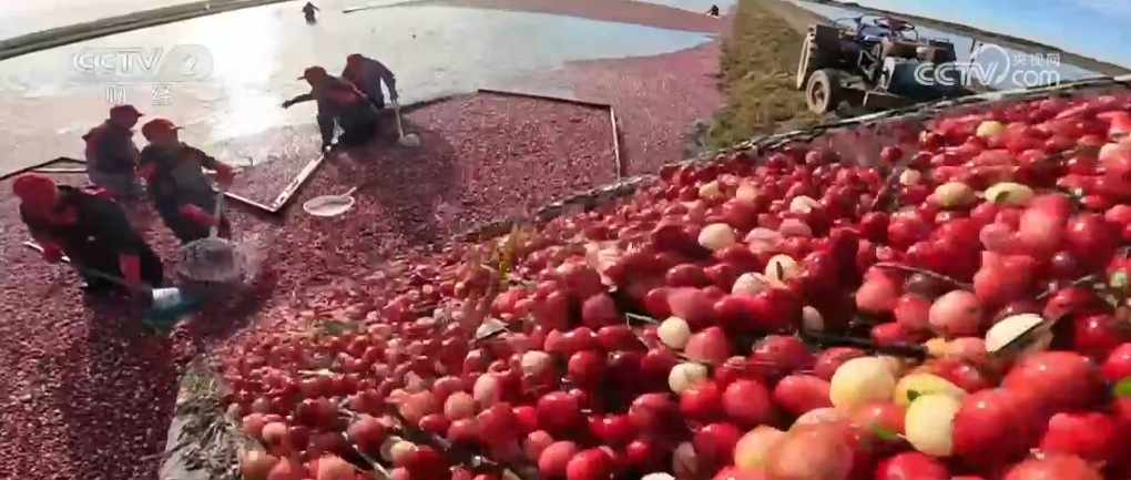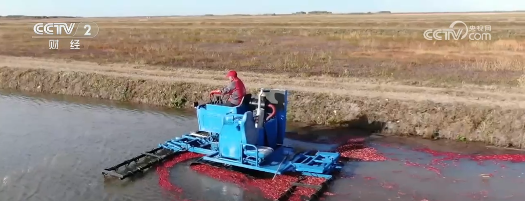 成熟的蔓越莓怎么收获呢?转过来看这里,这就是记者所说蔓越莓的地块为什么像池塘,因为这里灌进水,工作人员就驾驶着采收机就可以收获了,采收机上有两排钢条,它能将水里的蔓越莓从植株上脱落下来。因为蔓越莓里面是空心的,所以能够浮在水面上。我们看,采收机走过之后,后面的蔓越莓就漂上来了。工作人员只需要来回多次的行驶,就可以把成熟的果子都收获下来,这种方式收获率可以达到97%以上。每个地块都这么大,飘在水上的蔓越莓怎么才能收回来呢?工作人员在水里用木板把这些蔓越莓聚拢到一起,再通过提升机就可以装到车厢里了。每到蔓越莓收获的季节,田里就变成了红色的海洋,非常漂亮。