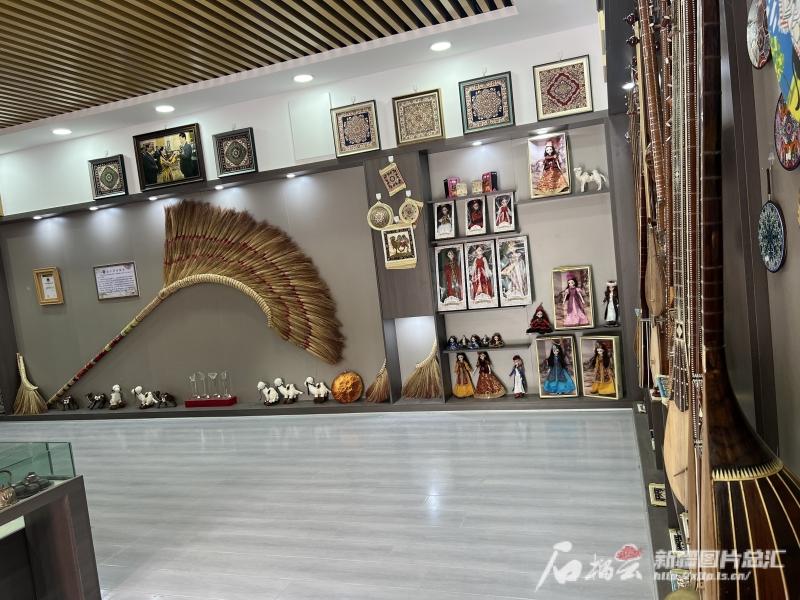 疏附县托克扎克镇阿亚格曼干村村委会里的手工艺品展示馆,陈列着各种手工艺品。石榴云/新疆日报记者 拍热扎提·阿不都摄