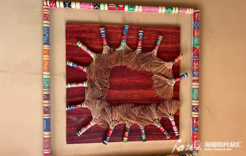疏附县托克扎克镇阿亚格曼干村手工扫把工艺坊里,村民依巴古丽·阿布都克然用扫把做的旅游纪念品。石榴云/新疆日报记者 拍热扎提·阿不都摄