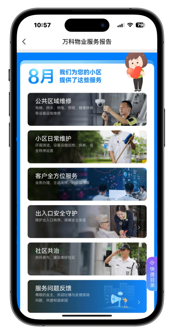 “我们在行业内首创了数字服务报告,承诺的每一项内容,都在这份报告中一一进行呈现。”邹明回复,这个报告会以月为单位自动生成,每一个业主都可以通过“住这儿”APP随时随地查看,报告中包括公共资源收益、小区重大事项进展、公共区域维修、安全秩序巡检、小区文化活动等。