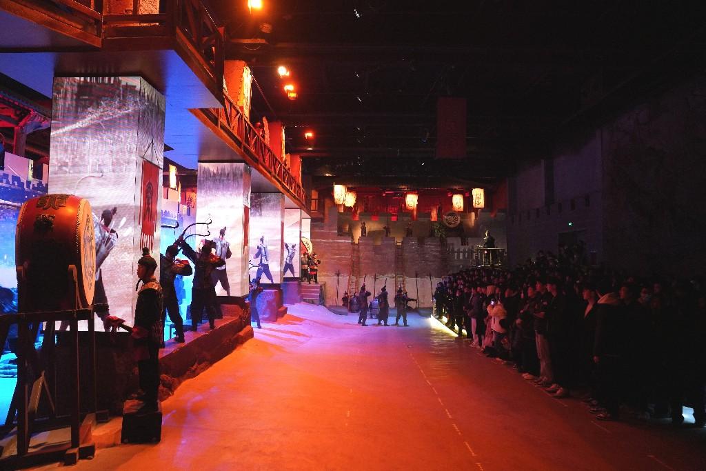听战鼓,观战阵……在大秦剧场,大气浑厚、荡气回肠的中国首部战争史诗剧《复活的军团》正在上演。在一个多小时的沉浸式演出中,大学生们随着演员们的行进式表演,行走在剧场,通过移步换景和剧情层层递进,与故事中的人物角色一道“穿越”时空,“身临其境”感受秦史秦事,厚植家国情怀。