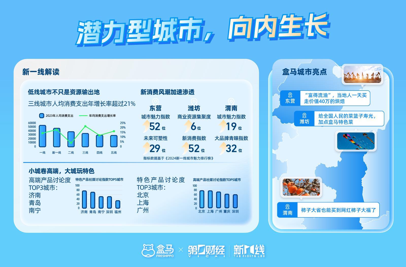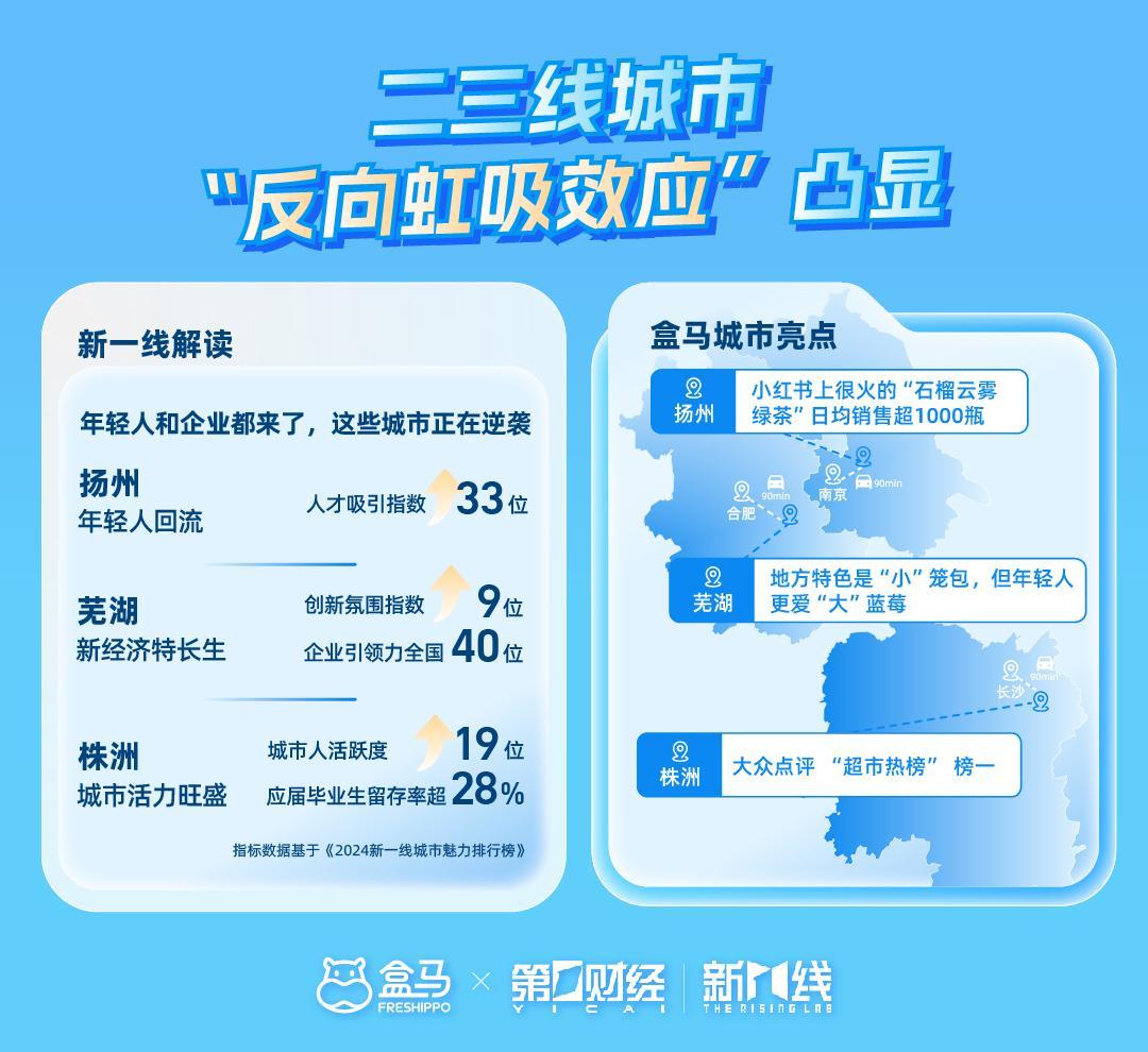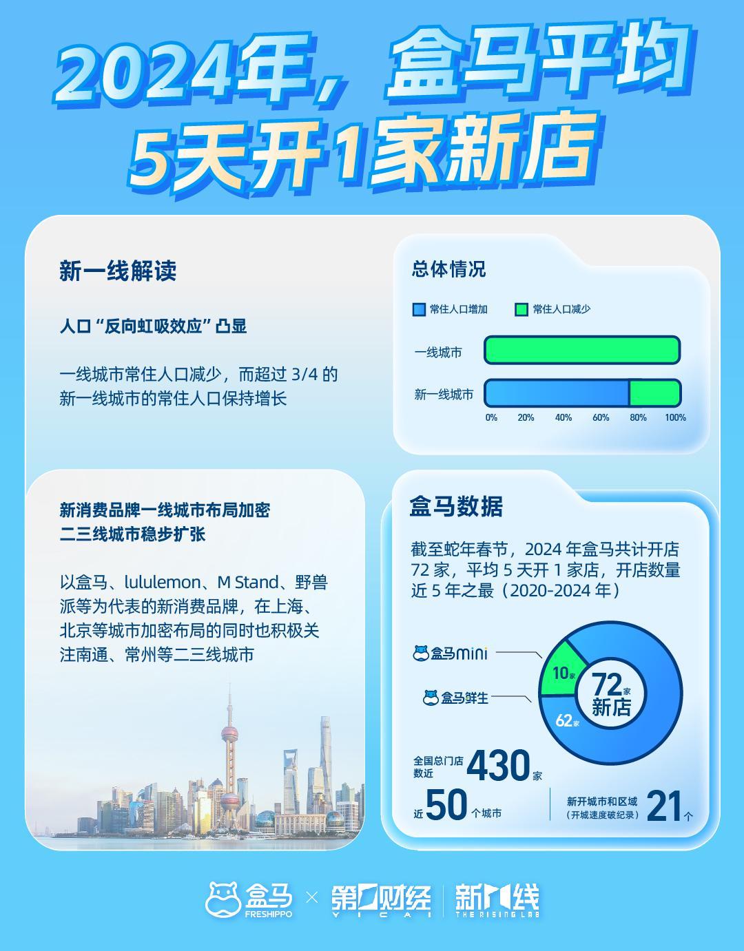 《报告》显示,盒马2024年共开出72家新店,其中三分之一位于二三线城市及县城。在新供给和新体验的双重促进下,这些城市正迸发出惊人的消费活力。