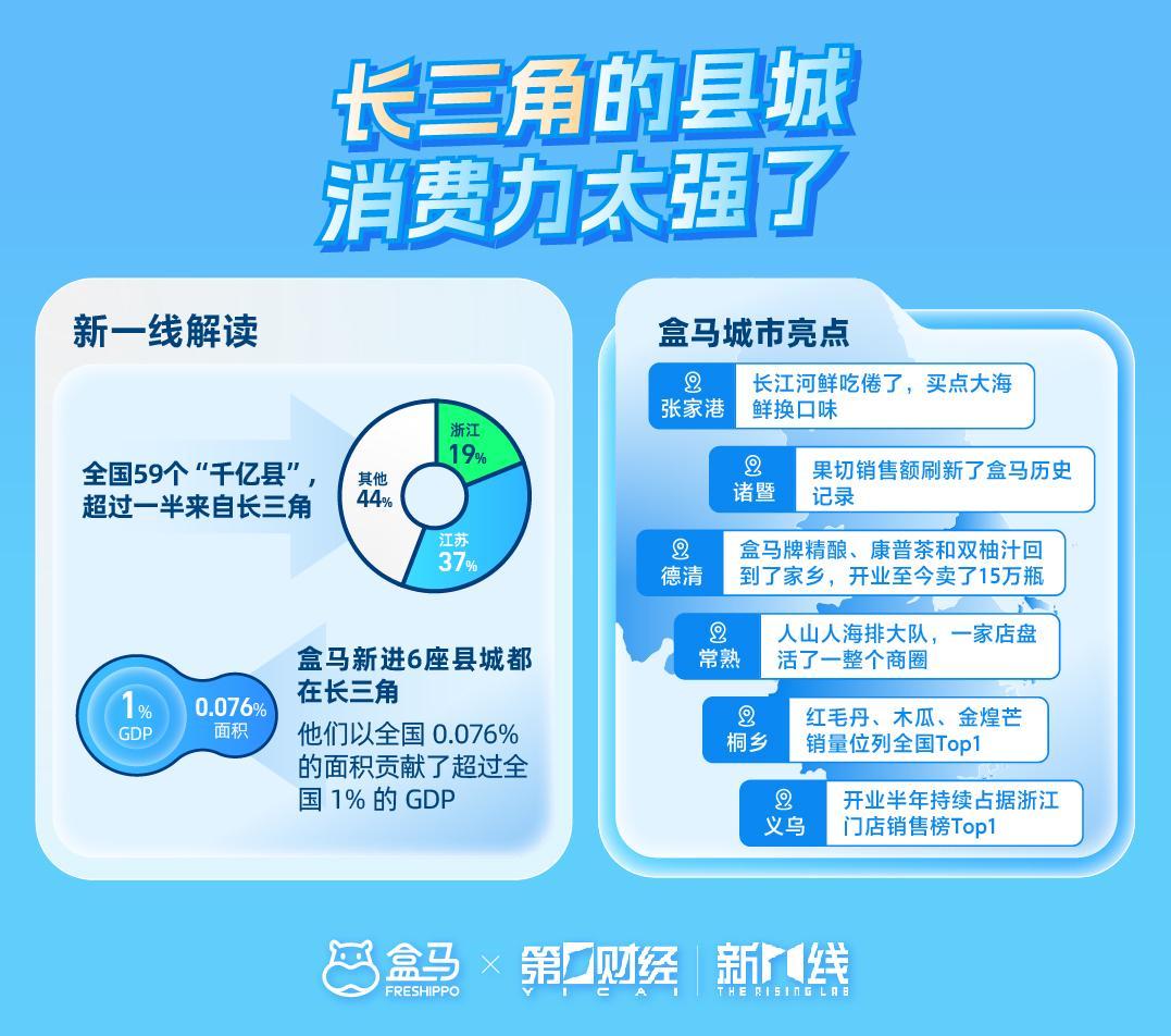 长三角仍是全国消费力最为强劲的区域之一,城市间的商业资源分布最为均衡。在全国59个“千亿县”中,超过一半来自长三角地区。今年盒马进入了其中6强:常熟、桐乡、义乌、诸暨、德清、张家港。每当盒马首店开业,这些地方都爆发出了惊人的消费活力。