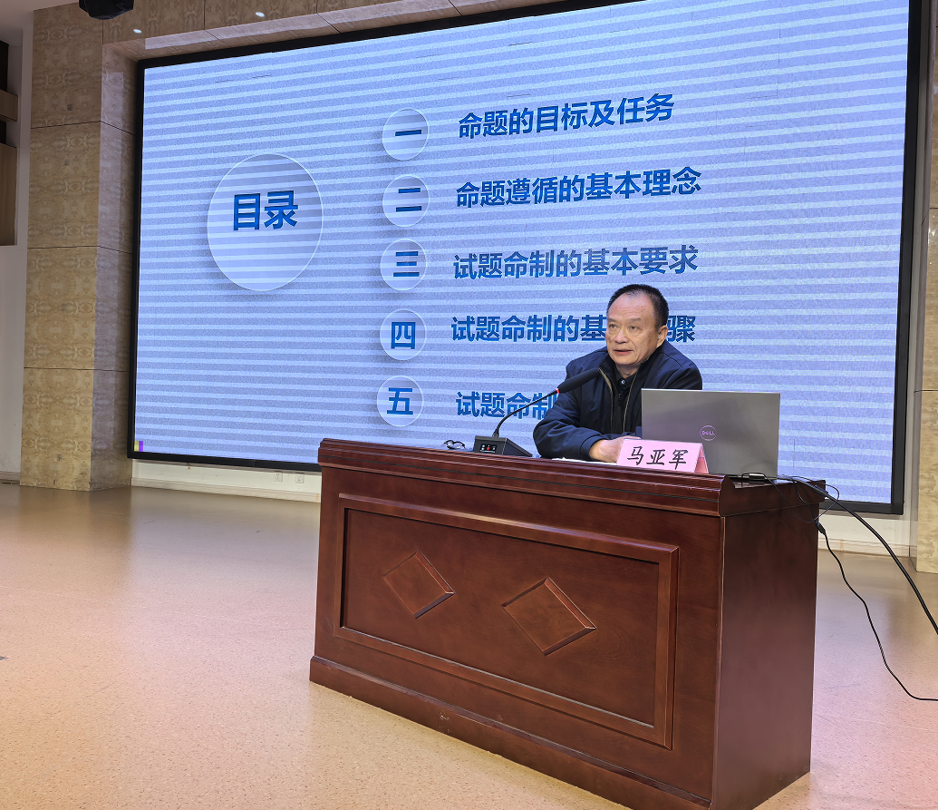 西安高级中学教学总监马亚军做了试题命题相关专题报告。马主任就命题的目标及任务、命题遵循的基本理念、试题命制的基本要求、试题命制的基本步骤等方面做了详尽的讲解,让参会教师受益匪浅。