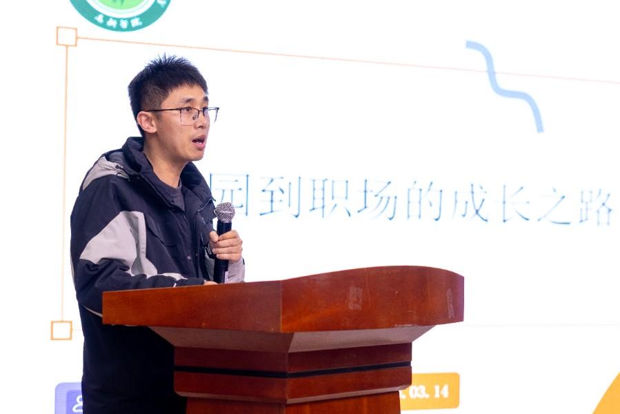 优秀校友曹剑以亲身经历为高新学子带来了一场充满力量的分享。他手握四项发明专利、六篇学术论文,参与“1600W通信二次电源模块开发”“4300W通信一次电源模块开发”等多个重点项目,展现了卓越的科研能力与工程实践精神。分享中,他展示了自己本科时期的生活照片,并由衷感恩于母校对自己的栽培。他坦言,考研不仅改变了自己的人生轨迹,更让他遇见了研究生导师刘树林教授,正是刘教授为他“打开了认识世界的大门”。他鼓励学弟学妹要珍惜大学时光,勇敢尝试新事物,多多历练,在攀登人生巅峰的道路上永不言弃!